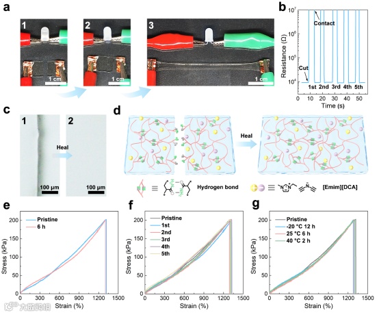 图2. a)切割的PAM-PEGMA-IL离子凝胶(1)修复前,(2) 修复后,以及(3)修复后被拉伸至400%应变的照片。b) PAM-PEGMA-IL离子凝胶在不同的切割/修复周期后导电性的恢复。c) 修复前后PAM-PEGMA-IL离子凝胶上切痕的光学显微镜图像。d) PAM-PEGMA-IL离子凝胶的自修复机制示意图。e)原始和修复的PAM-PEGMA-IL离子凝胶的应力-应变曲线。f) PAM-PEGMA-IL离子凝胶在不同切割和修复周期后的应力-应变曲线。g)切割的PAM-PEGMA-IL离子凝胶在不同温度下修复不同时间后的应力-应变曲线。