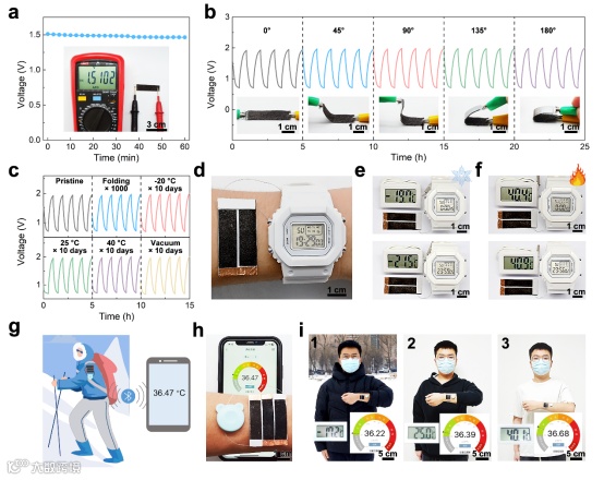 图4.a)SWF-ZAB的OCV。插图:照片显示了用万用表测量的已制备的SWF-ZAB的OCV。b)SWF-ZAB在弯曲角为45°、90°、135°和180°时的恒流充放电曲线。c)SWF-ZAB经过折叠1000个循环后,存储在−20、25和40 ℃在空气和25 ℃真空环境10天后的恒流充放电曲线。d)两个SWF-ZABs串联连接为一个数字手表供电的照片。e,f)由SWF-ZAB供电的数字手表在(e)−20 ℃和(f) 40 ℃下连续运行24小时的照片。g)使用SWF-ZABs驱动贴片式温度计以实现远程温度监测的示意图。h)显示一个贴片温度计由三个串联连接的SWF-ZABs供电的照片。i) SWF-ZAB驱动的贴片温度计在温度为(1)−17.2 ℃,(2)25.0 ℃和(3) 40.1 ℃的环境下将体温数据发送到智能手机。