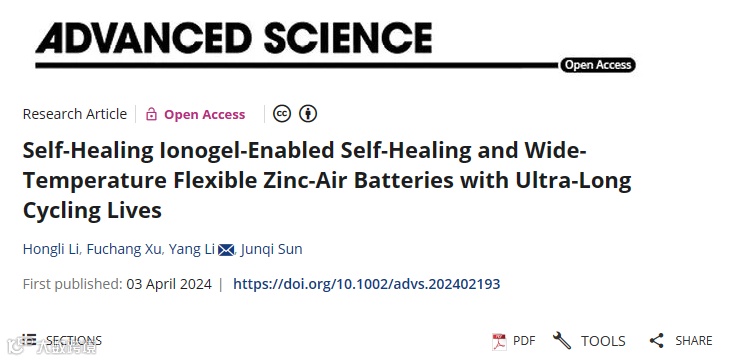 相关成果以Self-Healing Ionogel-Enabled Self-Healing and Wide-Temperature Flexible Zinc-Air Batteries with Ultra-Long Cycling Lives为题发表在《Advanced Science》(DOI: 10.1002/advs.202402193)。吉林大学超分子结构与材料国家重点实验室为第一单位,吉林大学化学学院博士研究生李弘历为论文的第一作者,李洋副教授为论文的独立通讯作者。该研究工作得到了国家自然科学基金(21971083)的支持。