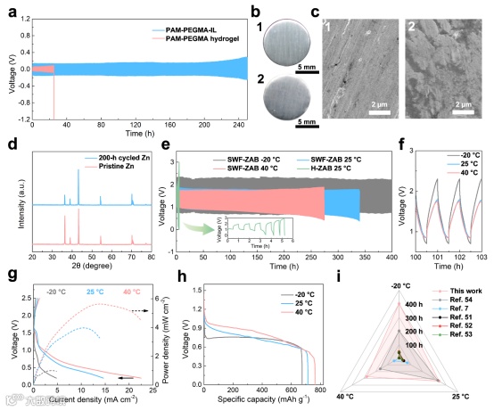 图3.a) 基于PAM-PEGMA-IL离子凝胶和PAM-PEGMA水凝胶在0.1 mA cm−2和0.05 mAh−2的锌-锌对称电池的恒流充放电曲线。b) (1)原始锌箔和(2)锌箔循环200 h后的照片。c) (1)原始锌箔和(2)锌箔循环200 h后的扫描电镜图像。d)锌箔在循环200 h前后的XRD图像。e) SWF-ZABs在−20、25和40 ℃时的恒流充放电曲线和H-ZAB在25 ℃时的恒流充放电曲线。f)SWF-ZAB在−20、25和40 ℃下100-103 h的恒流充放电曲线。g)SWF-ZAB在-20、25和40 ℃时的极化曲线和相应的功率密度曲线。h)SWF-ZAB在−20、25和40 ℃下的容量。i)SWF-ZAB在−20、25和40 ℃下与其它报道的水凝胶基ZABs的循环寿命的比较。