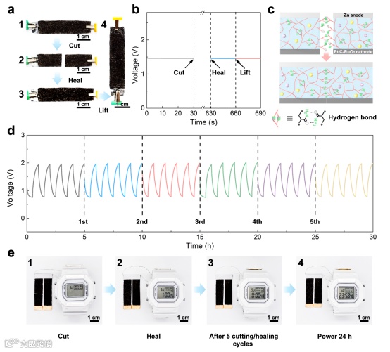 图5.a)(1)原始、(2)切割、(3)修复的SWF-ZAB和(4)修复的SWF-ZAB从一端提起而不断裂的照片。b)原始和修复的SWF-ZAB的OCV曲线。c)SWF-ZAB的修复机制示意图。d)SWF-ZAB在原始状态下和经过多次切割/修复周期后的恒流充放电曲线。e)照片显示SWF-ZAB被切割和修复5个周期(1-3),并稳定供电1天(4)的照片。