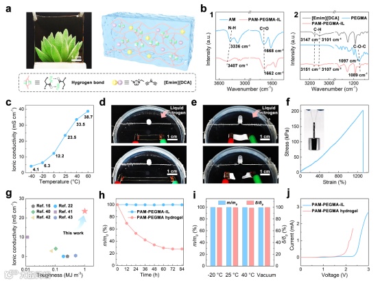 图1.a)PAM-PEGMA-IL离子凝胶的照片及其内部结构示意图。b)(1)AM和PAM-PEGMA-IL离子凝胶以及(2)[Emim][DCA]、PEGMA和PAM-PEGMA-IL离子凝胶的FTIR光谱。c) PAM-PEGMA-IL离子凝胶不同温度下的离子电导率。d) PAM-PEGMA-IL离子凝胶在-60 ℃下被拉伸到200%的应变并保持导电性。e) PAM-PEGMA水凝胶在-60 ℃下结冰断裂。f) PAM-PEGMA-IL离子凝胶的应力-应变曲线。插图:PAM-PEGMA-IL离子凝胶提起100克砝码的照片。g) PAM-PEGMA-IL离子凝胶和其他报道的室温自修复离子凝胶的离子电导率和韧性的Ashby图。h)在25 ℃下,PAM-PEGMA-IL离子凝胶和PAM-PEGMA水凝胶的质量变化(m/m0)。i) PAM-PEGMA-IL离子凝胶在−20、25、40 ℃和真空环境中储存10天后的质量变化(m/m0)和离子电导率变化(𝛿/𝛿0)。j) PAM-PEGMA-IL离子凝胶和PAM-PEGMA水凝胶的分解电压。