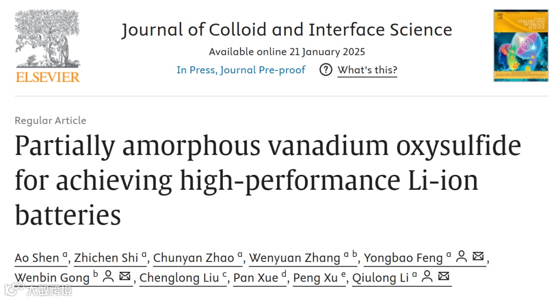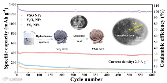钒基材料具有较高的理论容量和多种价态,被认为是锂离子电池很有前景的阳极材料。然而,循环和倍率性能受到其结构稳定性和导电性差的限制。本文,南京工业大学冯永宝和李秋龙教授团队在《Journal of Colloid And Interface Science》期刊发表名为“Partially Amorphous Vanadium Oxysulfide for Achieving High-Performance Li-Ion Batteries”的论文。实验和理论计算研究结果表明,通过引入非晶成分和氧空位可以提高其电子电导率,并为锂离子的嵌入提供丰富的通道和活性位点。制备得到的VSO NFs电极可以实现超高比容量(0.1 A g-1时为672.3 mAh g-1)和优异的倍率性能(2.0 A g-l时为433.1 mA h g-l),以及出色的循环稳定性(2.0 A g-1电流密度下循环600次后比容量为361.7 mAh g-l)。此外,组装的VSO NFs//LiFePO4全电池也显示出出色的倍率性能和循环寿命。因此,这种非晶化设计可以作为电化学储能领域制备高性能阳极材料的指导策略。