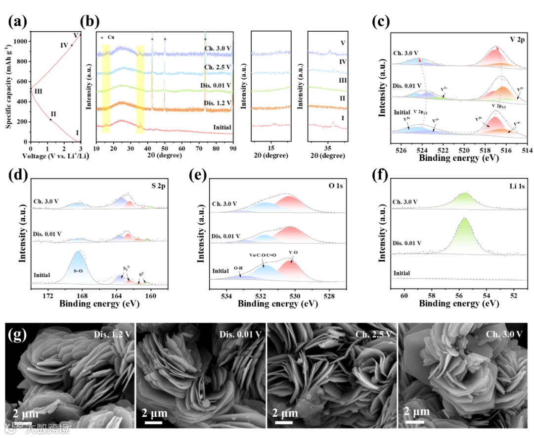 图5 VSO NFs的Li+存储机制。(a) 0.2 A g-1时的GCD曲线。(b) 不同放电/充电状态下的非原位XRD图谱。不同放电/充电状态下的(c)V 2p、(d)S 2p、(e)O 1s和(f)Li 1s的非原位XPS光谱。(g) 不同放电/充电状态下的SEM图像。