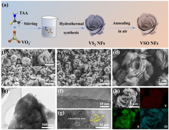 图1 (a)VSO NFs制备过程示意图。(b)VS2NFs和(c、d)VSO NFs的SEM图像。VSO NFs的(e)TEM和(f,g)HRTEM图像。(h)VSO NFs的V、S和O元素的EDS映射。