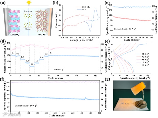 图7 VSO NFs//LFP全电池的电化学性能。(a) 示意图。(b) VSO NFs和LFP电极在1.0 mV s-1扫描速率下的CV曲线。(c) 0.2 A g-1电流密度下的循环性能。(d) 倍率性能。(e)不同电流密度下GCD曲线。(f) 1.0 A g-1的循环性能。(g)器件的简单应用。