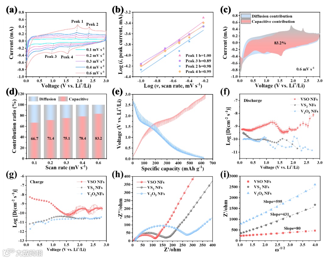 图4 反应动力学。(a) VSO NFs电极在不同扫描速率下的CV曲线。(b) 在0.1至0.6 mV s-1的扫描速率下,log(i)和log(v)之间的关系。(c) VSO NFs电极在0.6 mV s-1下的电容贡献。(d)VSO NFs电极在不同扫描速率下的电容贡献。(e) VSO NFs电极的GITT曲线。(f)放电和(g)充电过程中VSO NFs、VS2 NFs和V2O5NFs电极的Li+扩散系数。VSO NFs、VS2NFs和V2O5NFs电极的(h)EIS光谱和(i)Z'-ω-1/2关系的线性拟合。