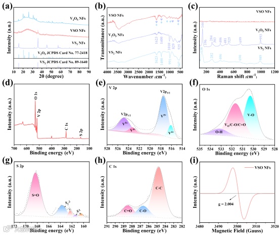 图2 VS2NFs, VSO NFs and V2O5 NFs的(a)XRD谱图,(b)FTIR谱图,(c)Raman谱图。VSO NFs的XPS(d)全谱,(e)V 2p,(f)O 1s,(g)S 2p,(h)C 1s的高分辨率光谱。(i)VSO NFs的EPR图。