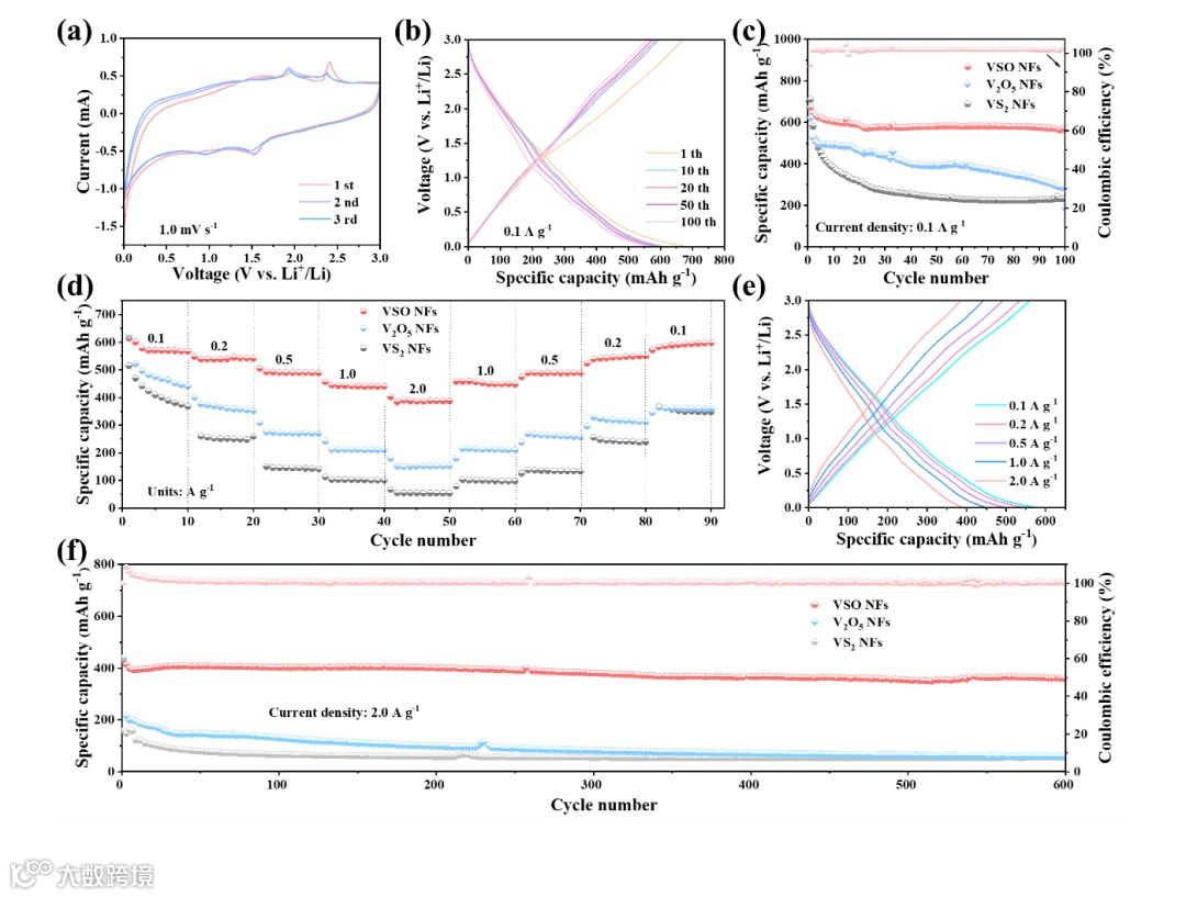 图3 (a)在扫描速率为1.0 mV s-1时,VSO NFs的CV曲线。在电流密度为0.1 A g-1时,(b)VSO NFs的GCD曲线,(c)VSO NFs的循环性能。VSO NFs在不同电流密度下(d)倍率性能,(e)GCD曲线。(f)在电流密度为2.0 A g-1时,VSO NFs的循环性能。