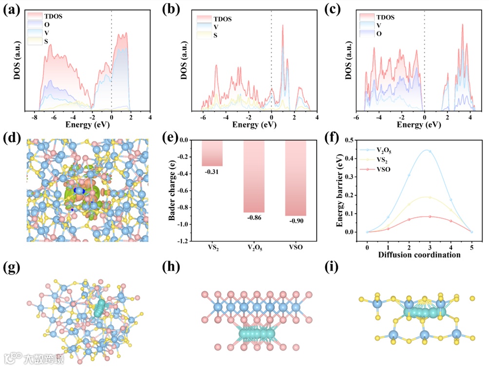 图6 DFT理论计算。计算(a)VSO、(b)VS2和(c)V2O5的DOS。(d) VSO的差分电荷密度图。(e) VS2、V2O5和VSO的Bader电荷。(f)Li+在VS2、V2O5和VSO中的扩散势垒。Li+在(g)VSO、(h)VS2和(i)V2O5中的迁移路径。