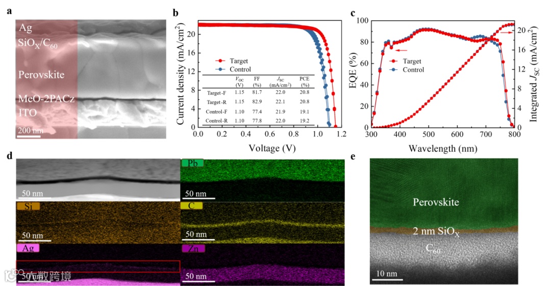 作者采用电子束OAD策略在钙钛矿/C60界面间沉积了一层超薄的SiOX钝化层。相较于垂直角度的沉积的SiOX,OAD策略下的SiOX钝化层作用后的钙钛矿的晶粒尺寸和晶体质量无显著变化,表明OAD方法造成的轰击损伤极小。经过SiOX钝化后的1.63 eV单结太阳能电池实现了50 mV的开路电压提升以及5%的填充因子提升,同时短路电流没有损失。通过透射电子显微镜(TEM)的结果可以观察到SiOX层实现了良好的覆盖性。