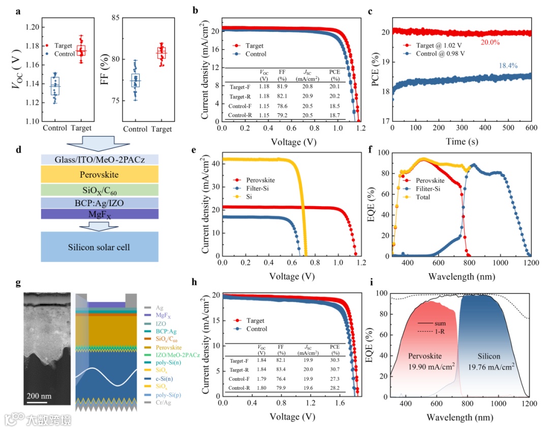 图1 SiOX钝化的1.63 eV单结太阳能电池器件表现以及SiOX层覆盖情况。