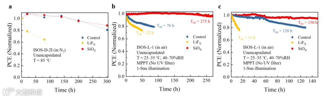 在更宽带隙的(1.68 eV)钙钛矿器件中,SiOX钝化层的引入使得器件的稳态PCE从18.2%提高到20.0%。在4-T机械叠层钙钛矿/硅串联太阳能电池中,得到了29.2%的PCE。进一步,将SiOX钝化层引入到2-T钙钛矿/硅串联电池后,叠层器件表现出了30.7%的瞬态PCE,稳态PCE达到30.2%。在1 cm2的2-T叠层器件中,SiOX钝化层的效果同样显著,实现了28.9%的PCE。在加速老化测试中,SiOX表现出了优越的热稳定性。与传统的LiFX钝化层相比,SiOX钝化层的器件在85°C的条件下经过300小时仍保持88%的初始PCE,而LiFX钝化层的器件在80小时后性能就明显衰减。此外,在AM 1.5G光照下,包含SiOX钝化层的单结器件能够在约275小时内保持初始PCE的95%,其2-T叠层器件也能够在约150小时内保持初始PCE的95%。
