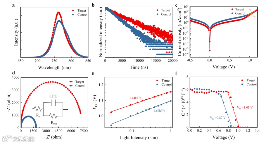 通过UPS测试证明,在钙钛矿表面覆盖SiOX后,钙钛矿表面的费米能级从-4.57 eV上移至-4.54 eV。KPFM测试中,SiOX沉积后钙钛矿表面的接触电势差从-549 mV增加到-474 mV,与UPS测试有着一致的变化。此外,SiOX沉积后钙钛矿表面的导带最小值(CBM)为-4.26 eV,更接近C60的CBM(-4.5 eV)。这些结果表明钝化后的钙钛矿具有更强的n型特性,有利于减少陷阱辅助复合并改善C60对电子的提取。这些变化归因于SiOX层中固有的固定电荷。通过构建MOS结构并进行C-V测试,观察到SiOX覆盖后平带电压从1.23 V降低至1.15 V,表明SiOX层内存在正电荷,这些正电荷吸引电子并导致能带向下弯曲。综上所述,SiOX钝化层通过调控界面能级,增强了钙钛矿太阳能电池的n型特性,改善了电子提取效率,并增强了界面的电子选择性,从而有助于提升电池性能。