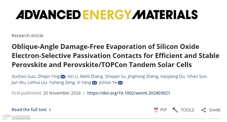 用于高效稳定钙钛矿及钙钛矿/TOPCon串联太阳能电池的斜角无损伤硅氧化物电子选择性钝化接触层蒸发