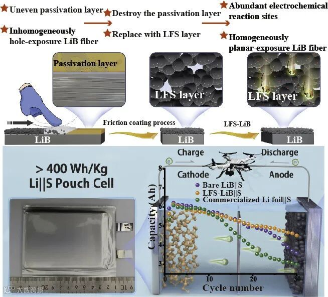 图1. 采用一种摩擦涂层策略构建充满电化学活性位点的界面层,有效地解决了LiB合金负极的表面问题,使内部LiB纤维骨架在充放电过程中均匀地平面式地暴露,从而实现具有稳定循环性能的高能量密度Li||S软包电池。