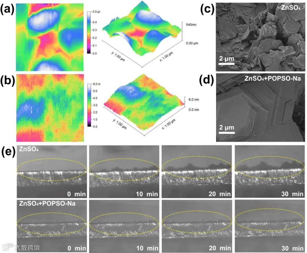 图3. 硫酸锌溶液和混合电解质中锌沉积的比较。锌阳极在(a) ZnSO4和(b) ZnSO4+POPSO-Na电解质中以1 mAh cm-1电流密度循环150小时的AFM图像。锌阳极在(c) ZnSO4和(d) ZnSO4+POPSO-Na电解质中循环后的SEM图像。(e)不同电解质中电流密度为10 mAh cm-2的镀锌过程的原位光学显微镜图像。
