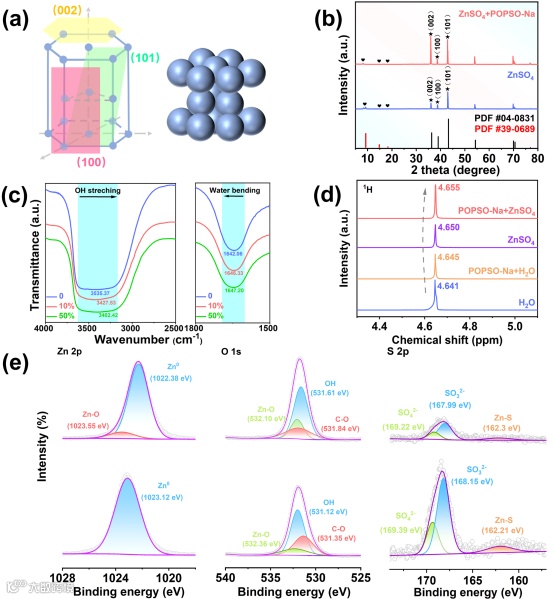 图2. (a)金属Zn的晶体结构模型。(b)锌阳极在不同电解质中循环后的XRD谱图比较。(c) ZnSO4和ZnSO4+POPSO-Na电解质的FTIR光谱。(d)以氘代水为溶剂的不同溶液的核磁共振。(e) Zn箔在ZnSO4+POPSO-Na(上)和ZnSO4(下)电解质中以1mA cm-2循环200 h的高分辨率Zn 2p、O 1s和S 2p XPS光谱。