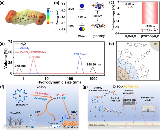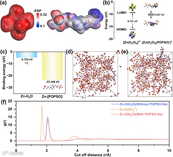 图 4. (a)[Zn(H2O)6]2+(左)和[POPSO]-(右)的静电势图。(b)[Zn(H2O)6]2+和[Zn(H2O)5(POPSO)-]+的LUMO-HOMO带隙及示意图。(c) Zn- H2O与Zn-[POPSO]-的结合能。(d) ZnSO4和(e) ZnSO4+POPSO-Na电解质的MD模拟快照。(f)两种电解质环境下Zn2+和H2O的RDFs。