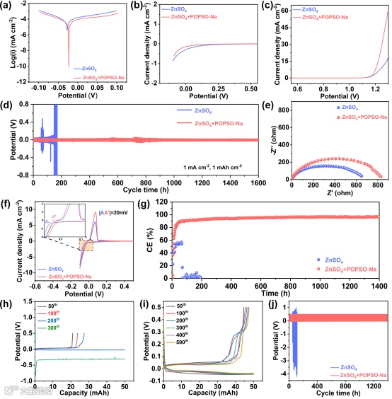 图5. (a)在ZnSO4和ZnSO4+ POPSO-Na电解质中,用三电极系统扫描速率为5 mV s−1时,锌箔的Tafel曲线。(b-c)两种不同电解质下Zn||Cu电池的LSV曲线。(d)使用两种不同电解质的锌Zn||Zn对称电池的长期循环性能。(e)两种不同电解质Zn||Zn对称电池的Nyquist图。(f) ZnSO4和ZnSO4+POPSO-Na电解质中Zn||Cu电池的CV曲线。(g)两种电解质下Zn||Cu电池的CE对比图。(h) ZnSO4和(i) ZnSO4+POPSO-Na电解质下Zn| |Cu电池的电位容量曲线。(j)不同电解质下Zn||Cu电池长循环性能示意图。