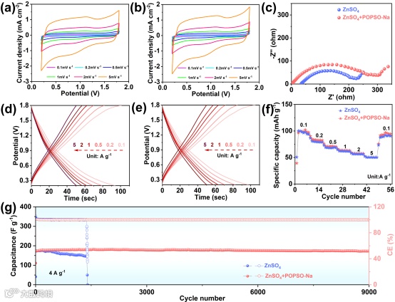 图6. (a) ZnSO4和(b) ZnSO4+POPSO-Na中不同扫描速率下Zn||AC ZICs的CV曲线。(c)不同电解质中ZICs的EIS曲线。ZICs在(d) ZnSO4和(e) ZnSO4+POPSO-Na电解质中的典型充放电曲线。(f)不同电解质下ZIC在不同电流密度下的速率性能。(g) ZICs在不同电解质下的循环稳定性。