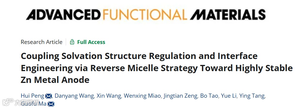 Hui Peng,* Danyang Wang, Xin Wang, Wenxing Miao, Jingtian Zeng, Bo Tao, Yue Li, Ying Tang, Guofu Ma*, Coupling Solvation Structure Regulation and Interface Engineering via Reverse Micelle Strategy Toward Highly Stable Zn Metal Anode, Adv. Funct. Mater. 2024, 2417695.