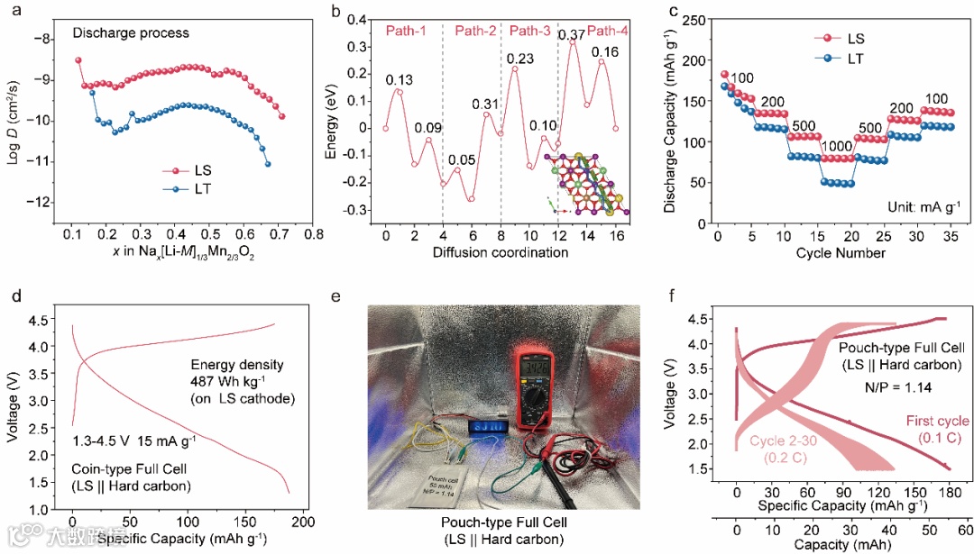 图4 (a)LS和LT首圈放电过程中Na离子扩散系数比较;(b)LS扩散路径与势垒分析;(c)LS和LT倍率性能比较;(d)纽扣全电池的性能;(e)软包全电池的照片;(f)软包电池在0.1C和0.2C电流密度下的恒电流充放电曲线。