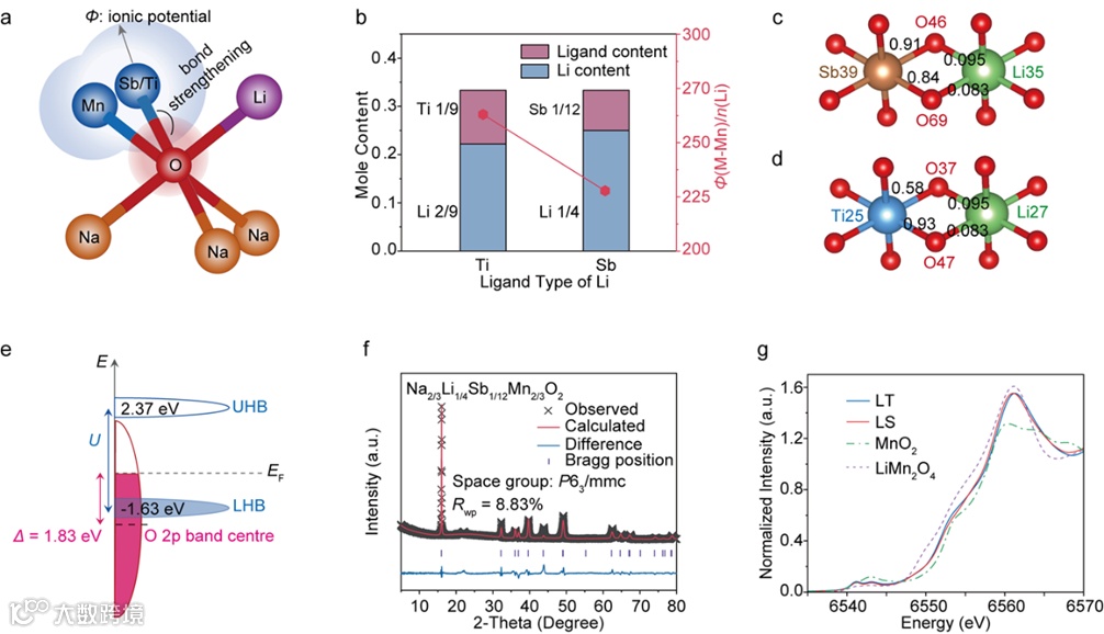图1 (a)Sb/Ti在TM位点取代对TM−O共价键影响的示意图;(b)Sb/Ti在TM位点取代的组成摩尔含量和离子电势比较。(c)Sb–O–Li和(d)Ti–O–Li中的共价键分析;(e)初始LS正极的能级结构示意图;(f)P2型LS正极粉末XRD图谱;(g)初始状态下LS和LT的Mn元素X射线吸收谱。