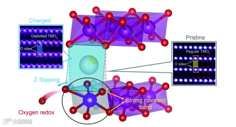 另一方面,锰元素和氧元素的同步辐射X射线吸收谱表明在第一次充电过程中仅仅是氧来提供容量(图3a,b),氧元素软X射线吸收谱也为晶格氧的电子得失提供了有力的证据。通过电子显微镜暗场和明场两方面,均可以观察到初始态中规整的过渡金属氧八面体和NaO6三棱柱(图3c),而充电态中的八面体和三棱柱均发生扭曲(图3d),这恰恰是氧的电子结构发生变化导致的。为了证明这一说法, Mn的X射线精细结构谱的小波变化可以发现在充电过程中其第一壳层(Mn−O)会发生轻微的收缩(图3e,f)。因此,基于电子显微学和谱学两方面的证据,作者提出了Z相产生的机制(图3g,h):在晶格氧丢失电子时,其过渡金属八面体中的共价键收缩,带动了与之相连的NaO6三棱柱发生扭转,而当过渡金属中存在强离子电势的元素时,强烈的共价作用会抑制层间滑移,使得其只能产生轻微的Z相滑移。