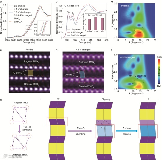 图3 (a)LS在不同充放电状态下前两圈Mn元素的硬X射线吸收谱;(b)LS在不同充放电状态下O的K边软X射线吸收谱;(c)初始态和(d)充电态下LS的STEM局部图像;(e)初始态和(f)充电态下LS正极中Mn元素的小波变换X射线精细结构光谱;(g)TMO6八面体畸变的示意图;(h)Z相产生的机理图。