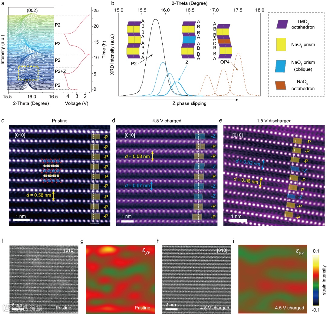 图2 (a)LS正极电化学原位XRD图谱;(b)P2、Z和OP4的结构差异示意图;LS在(c)初始态、(d)充电状态和(e)放电状态下的HAADF-STEM图像;(f)初始态LS的HAADF-STEM图像及相应的(g)应力分析;(h)充电态下LS的HAADF-STEM图像及相应的(i)应力分析。