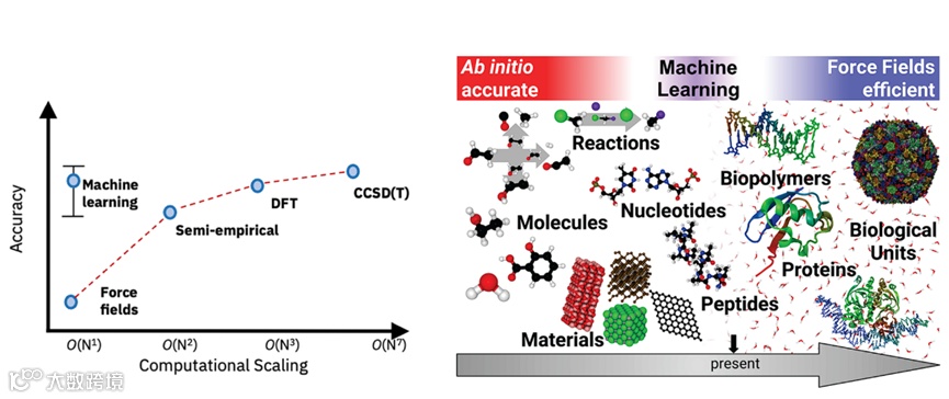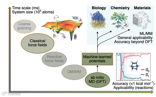随着计算机算力的迅速发展,通过 ML-FFs 实现第一性原理级别精度的大规模分子模拟研究已成为现实。机器学习方法还使人们对原本以为熟知的系统有了新的化学认知,例如小分子的非对称电子效应等现象,使研究者们能够更好地理解实验结果。由此可见,ML-FFs 极有可能成为现代计算化学与分子模拟的重要组成部分。