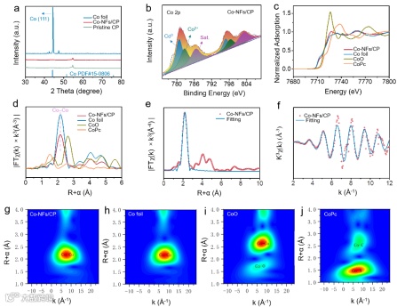 图2. (a)Co-NFs/CP, CP和商业Co箔的X射线衍射图。(b)Co-NFs/CP的X射线光电子能谱。(c-j)Co-NFs/CP和各种含Co的标准样品的同步辐射表征图。