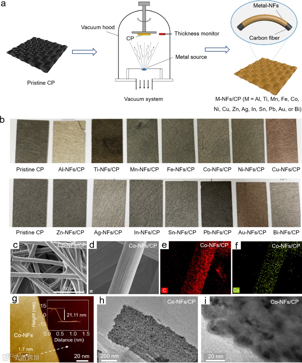 图1. (a)通过热蒸镀法在碳纸上生长金属M(M=Al、Ti、Mn、Fe、Co、Ni、Cu、Zn、Ag、In、Sn、Pb、Au或Bi)纳米膜的合成流程图。(b) M-NFs/CP电极的光学照片。(c)Co-NFs/CP电极的(c, d)扫描电子显微镜, (e, f)元素面分布, (g)原子力显微镜,(h)透射电子显微镜和(i)高分辨率透射电子显微镜图。