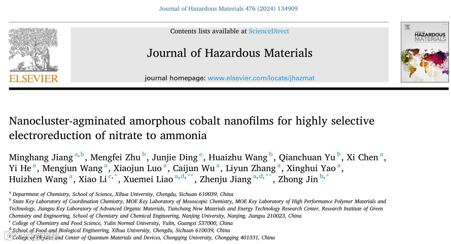 近日,来自西华大学的江明航博士/廖雪梅教授/蒋珍菊教授、南京大学的金钟教授和玉林师范学院的黎晓副教授合作,在国际TOP期刊Journal of Hazardous Materials上发表题为“Nanocluster-agminated amorphous cobalt nanofilms for highly selective electroreduction of nitrate to ammonia”的研究文章。