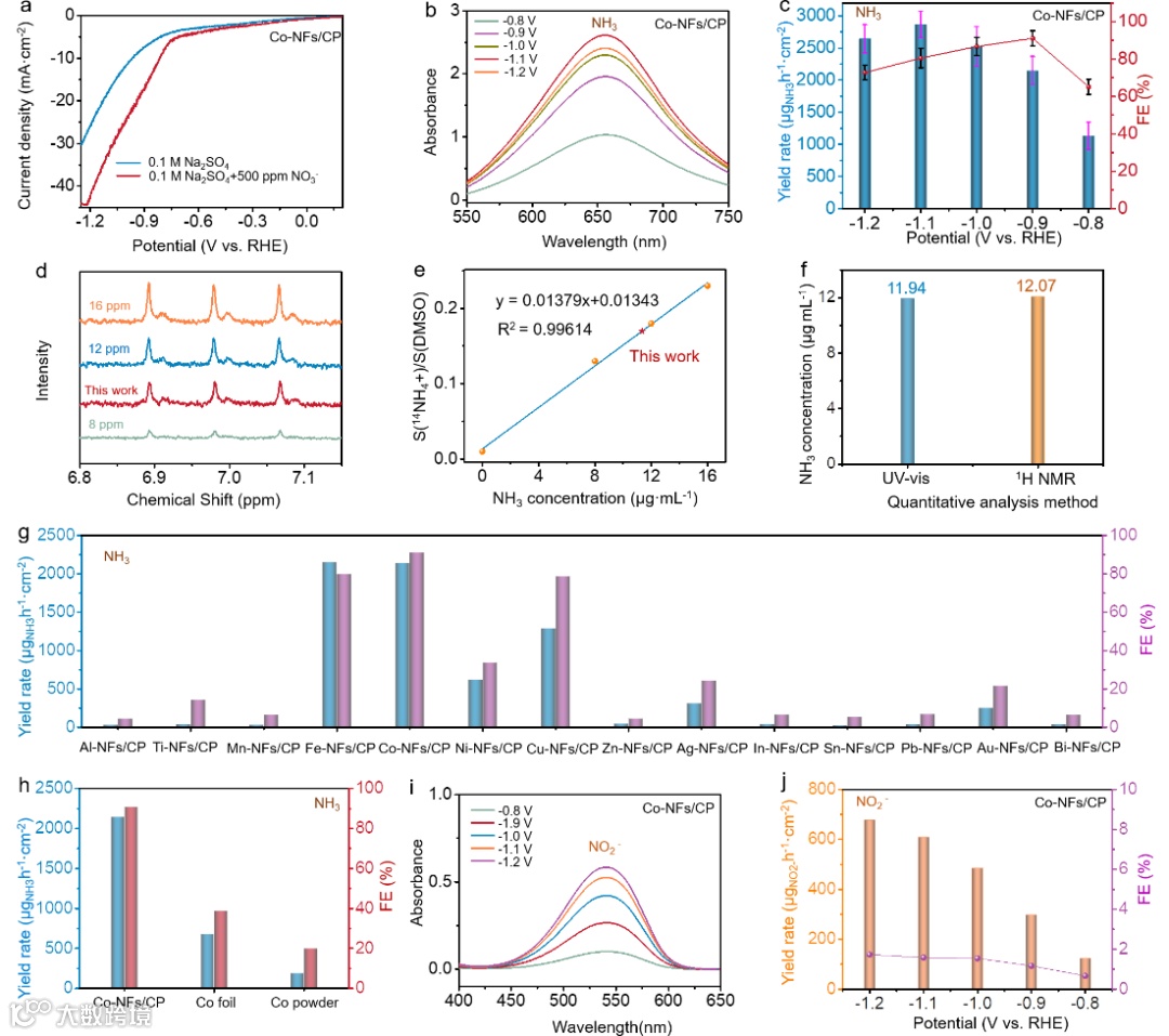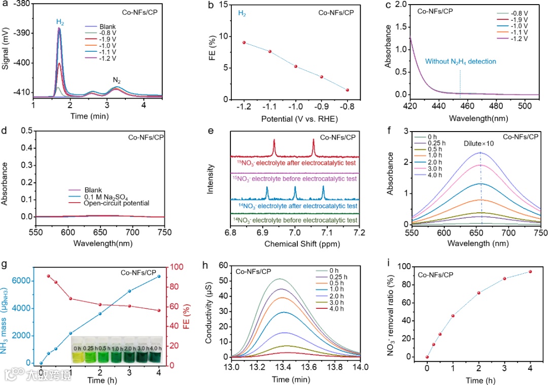 图4. Co-NFs/CP对电催化NITRR合成氨的产物选择性和稳定性表征。