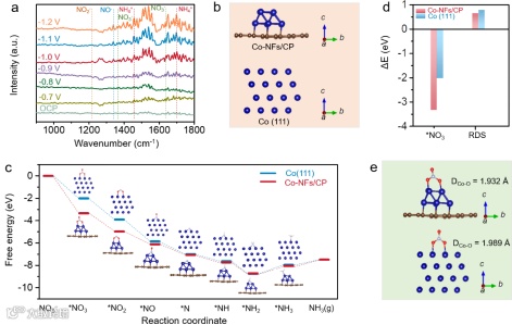 图5. 电催化NITRR过程中,原位红外光谱检测Co-NFs/CP表面产生的关键活性中间体信号,并结合理论计算研究在Co-NFs/CP表面上电催化NITRR合成氨的可能反应机制。
