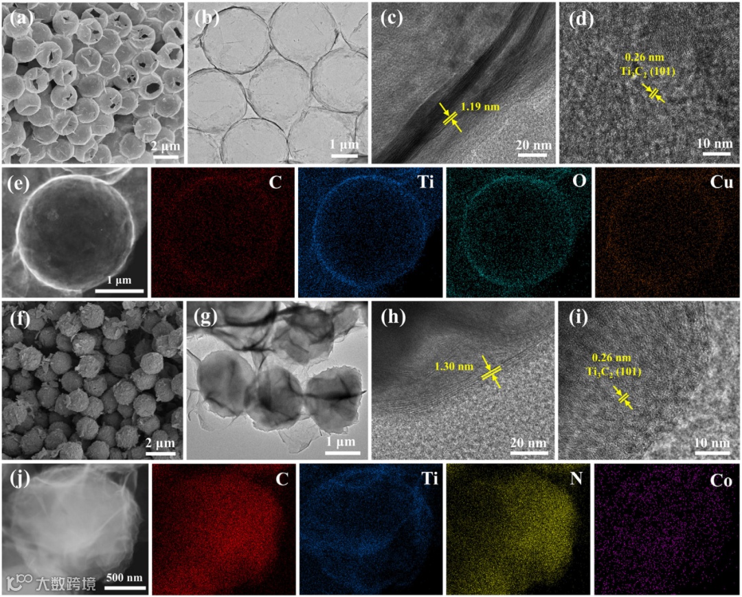 图2. Cu-HMXS的(a)SEM,(b)TEM,(c,d)HRTEM,(e)HAADF-STEM图像和相应的EDS图谱。Co-HNMXS的(f)SEM,(g)TEM,(h,i)HRTEM,(j)HAADF-STEM图像和相应的EDS图谱。