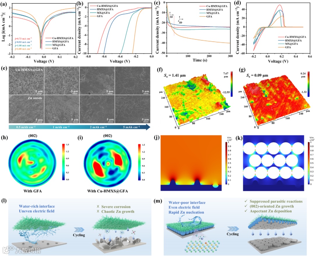 图5. (a)线性极化,(b)线性扫描伏安法,(c)计时电流法,以及(d)由Cu-HMXS@GFA、HMXS@GFA、MX@GFA和GFA隔膜组装的电池的Zn||Cu循环伏安曲线。(e)沉积不同容量后Cu-HMXS@GFA隔膜和锌负极的SEM图像。在1 mA cm⁻²/10 mAh cm⁻²下循环十次后,使用(f)GFA和(g)Cu-HMXS@GFA隔膜的锌负极的三维光学轮廓分析。在1 mA cm⁻²/10 mAh cm⁻²下循环十次后,使用(h)GFA和(i)Cu-HMXS@GFA隔膜的锌负极的(002)极图。使用(j)GFA和(k)Cu-HMXS@GFA隔膜的锌负极的电场模拟。使用(l)GFA和(m)Cu-HMXS@GFA隔膜的锌沉积过程的示意图。