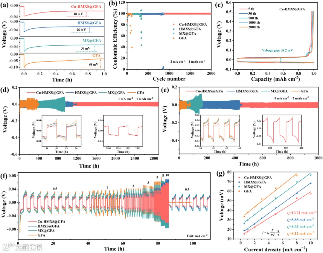 图4. (a)在1 mA cm⁻²下的成核过电位。(b)在2 mA cm⁻²、1 mAh cm⁻²时的库仑效率,以及(c)相应的电压-容量曲线。(d)在1 mA cm⁻²、1 mAh cm⁻²和(e)在5 mA cm⁻²、2 mAh cm⁻²下的循环性能。(f)从0.5至10 mA cm⁻²的倍率性能,以及(g)各种材料相应的交换电流密度。