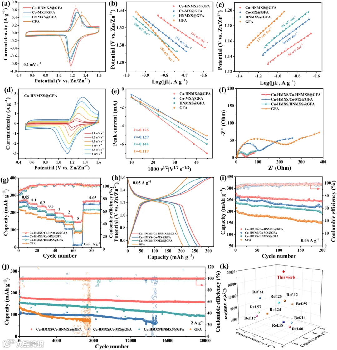 图6. (a)扫描速率为0.2 mV s⁻¹时的CV曲线,由Co-HNMXS@GFA、Co-MX@GFA、HNMXS@GFA和GFA隔膜组装的电池的(b)还原过程和(c)氧化过程的塔菲尔斜率。(d)Co-HNMXS@GFA隔膜在0.1-2 mV s⁻¹的循环伏安曲线。(e)根据Randles-Ševčík方程拟合的斜率。(f)Nyquist曲线,(g)倍率性能,(h)由Cu-HMXS/Co-HNMXS@GFA、Cu-HMXS/Co-MX@GFA、Cu-HMXS/HNMXS@GFA和Cu-HMXS@GFA隔膜组装的Zn-I₂电池在0.05 A g⁻¹时的充放电曲线,在(i)0.05 A g⁻¹和(j)2 A g⁻¹下的循环性能。(k)由Janus隔膜组装的Zn-I₂电池的性能与已报道工作的性能比较。