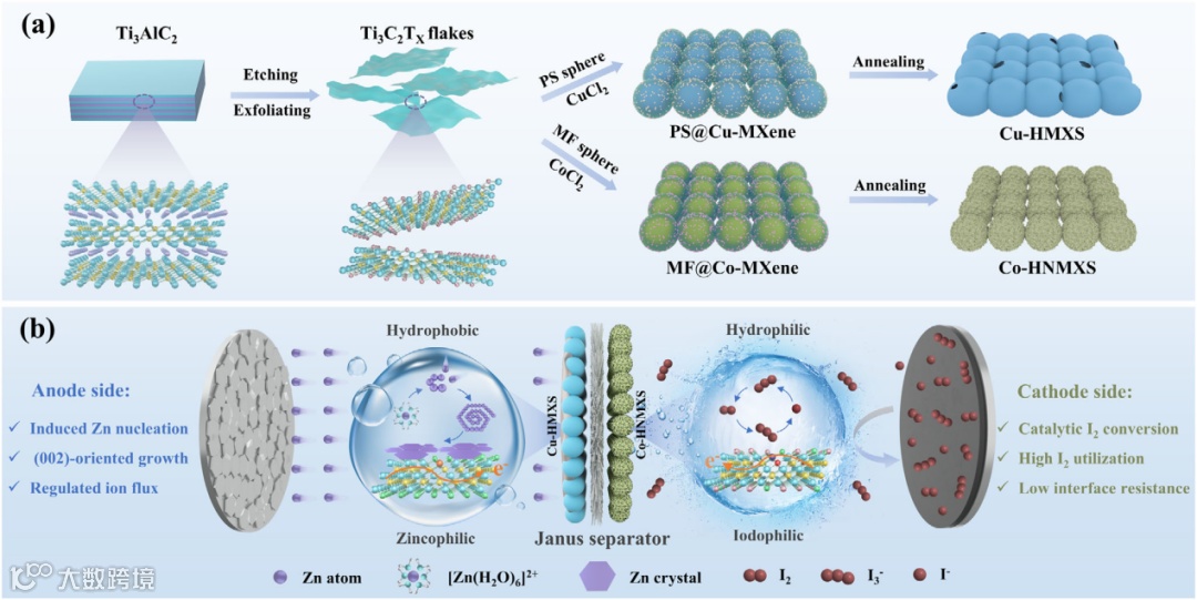 图1. (a)Cu-HMXS与Co-HNMXS的制备示意图。(b)Cu-HMXS/Co-HNMXS@GFA隔膜的机理阐释。