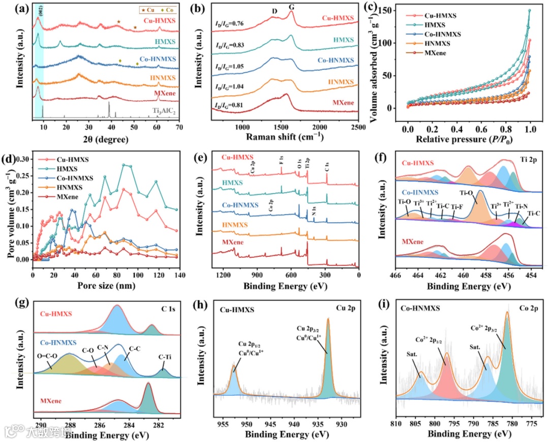 图3. Cu-HMXS、HMXS、Co-HNMXS、HNMXS和MXene的(a)XRD图谱、(b)拉曼光谱、(c)N₂吸附-脱附等温线、(d)孔径分布,以及(e)XPS全谱。Cu-HMXS、Co-HNMXS和MXene的高分辨XPS光谱:(f)Ti 2p、(g)C 1s。Cu-HMXS的(h)Cu 2p,以及Co-HNMXS的(i)Co 2p高分辨XPS光谱。