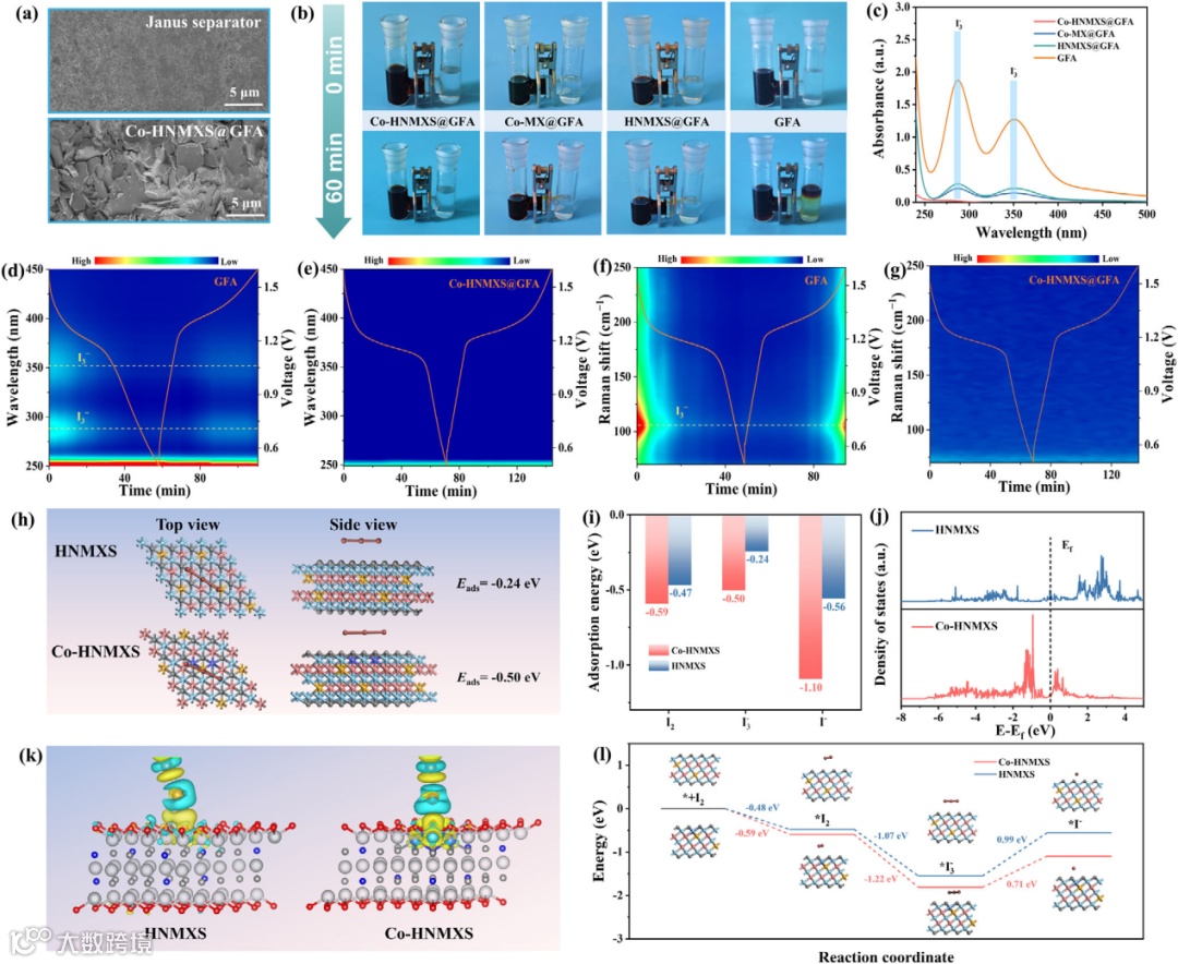 图7. (a)基于Janus隔膜(上)和Co-HNMXS@GFA隔膜(下)循环后的锌负极SEM图像。(b)不同隔膜在H型电池中多碘化物的扩散,以及(c)静置60分钟后右侧溶液相应的紫外-可见光谱。使用(d)GFA和(e)Co-HNMXS@GFA隔膜的Zn-I₂电池的原位紫外-可见光谱。使用(f)GFA和(g)Co-HNMXS@GFA隔膜的Zn-I₂电池的原位拉曼光谱。(h)HNMXS和Co-HNMXS的DFT优化模型。(i)碘物种的吸附能计算。(j)HNMXS和Co-HNMXS的态密度分析。(k)I₂在HNMXS和Co-HNMXS上的差分电荷密度。(l)HNMXS和Co-HNMXS上碘还原的反应能垒。