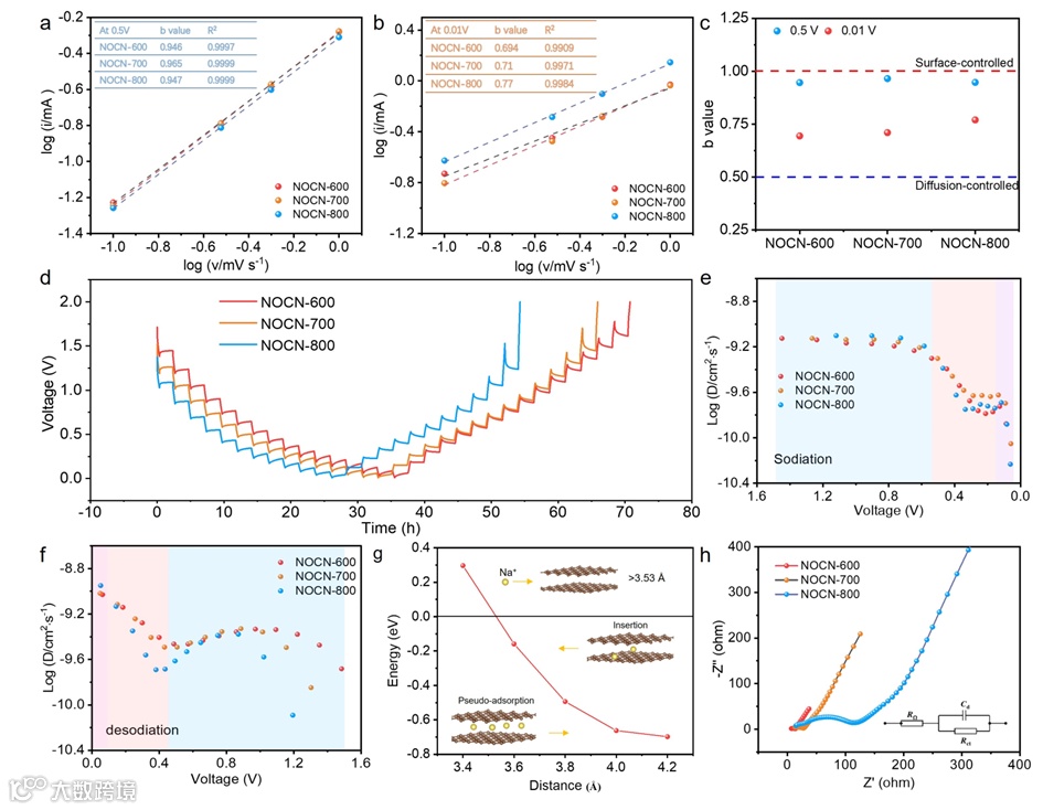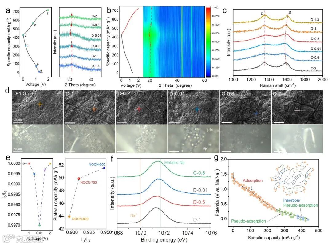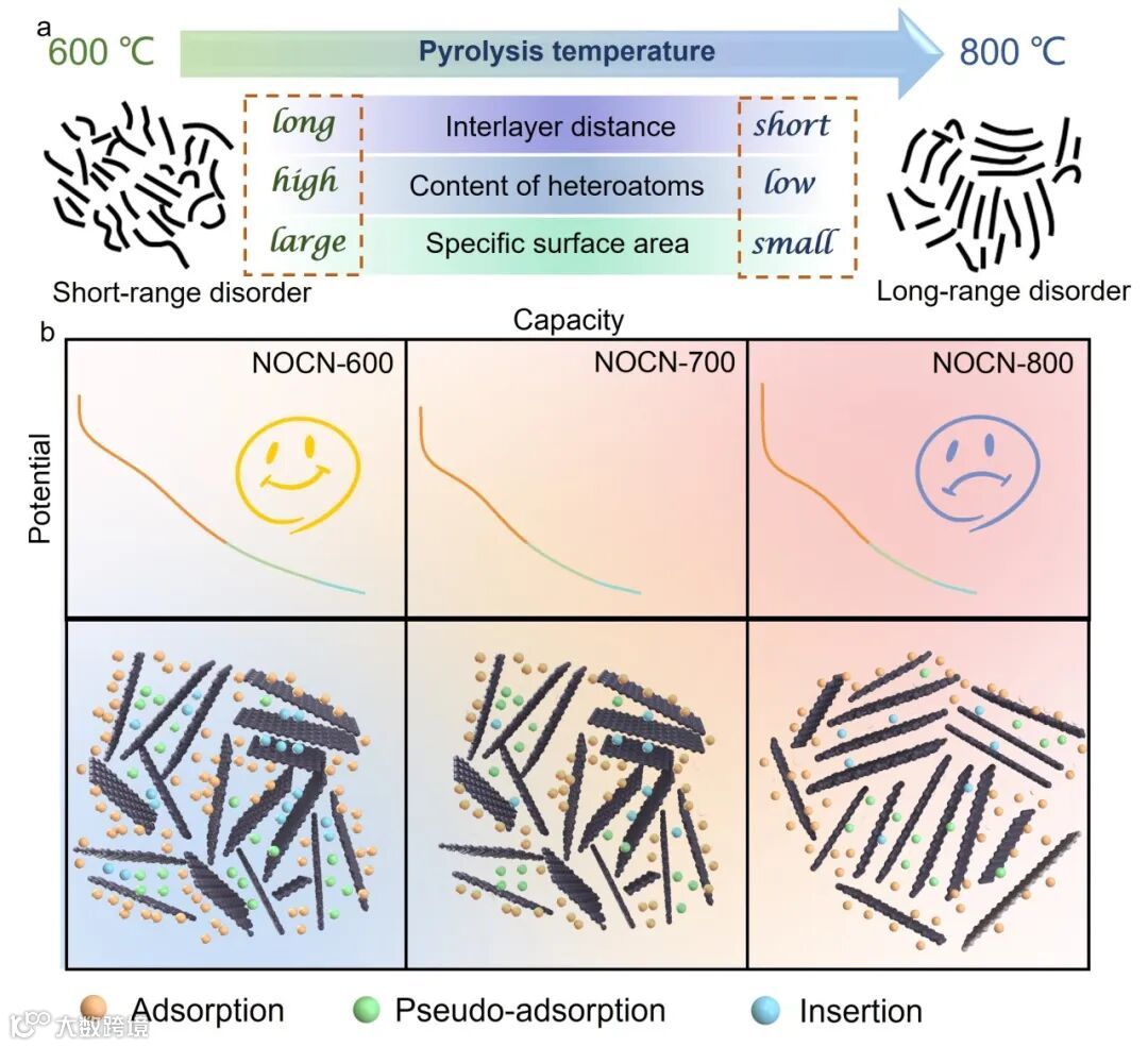 3.储钠机制: 研究揭示了NOCN中钠离子存储的三个阶段:吸附(>0.4 V)、伪吸附(0.4-0.1 V)、插层以及伪吸附共存(<0.1 V)。这一机制的阐明有助于理解硬碳材料的钠存储行为,并为设计高性能硬碳负极提供了理论基础。