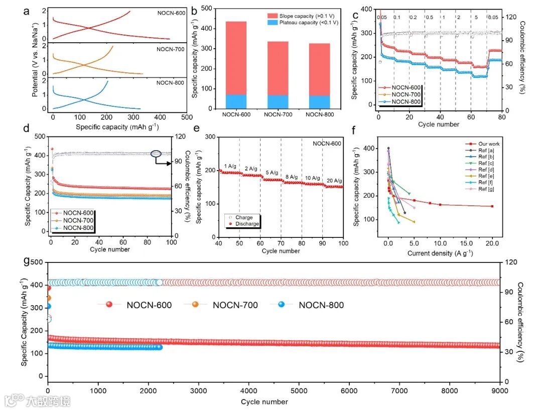 2. 电化学性能: NOCN-600在20 A g-1的高电流密度下展现出约150 mAh g-1的出色倍率性能,并且在9000次循环后仍有70.6%的容量保持率。