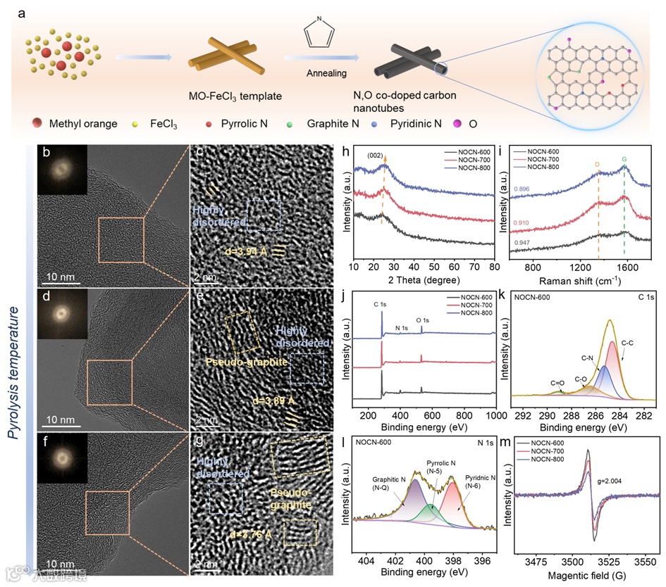 为了解决这一挑战,研究者们探索了杂原子掺杂、孔结构设计和纳米形貌调控等多种方法。特别是,低温热解技术能够最大化保留硬碳材料中的缺陷,有利于离子的快速传输,这对于开发高性能HC材料至关重要。本研究通过低温碳化成功合成了氮氧共掺杂碳纳米管(NOCN),揭示了其“坡主导”特性,并深入探讨了其钠存储机制,为高性能HC材料的开发提供了新见解。