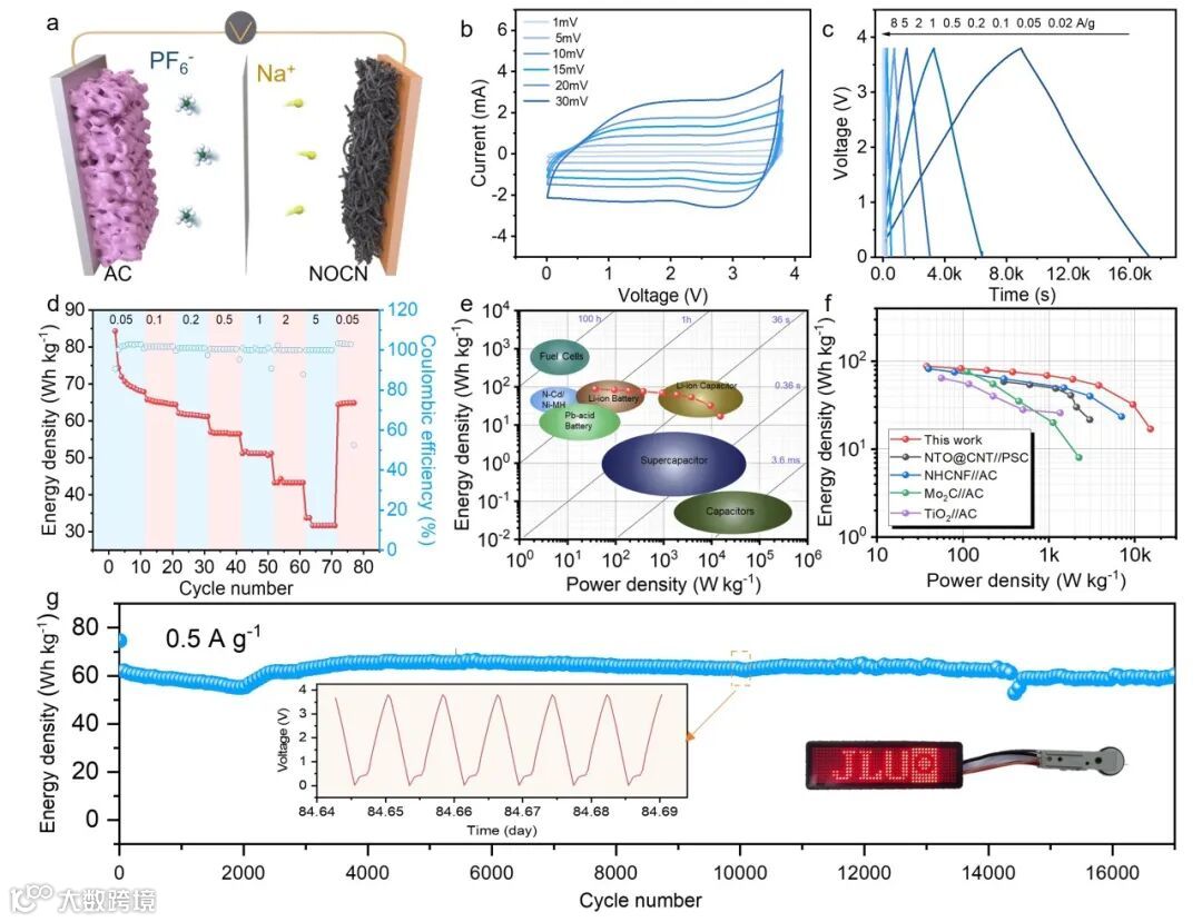 4.应用前景: 基于NOCN-600的钠离子电容器(SICs)展现了优异的能量密度和功率密度,以及超过17000次循环的稳定循环性能,证明了其在实际应用中的潜力