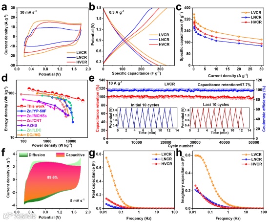 图4. 基于LVCR、LNCR和HVCR的ZIC的(a)CV和(b)GCD曲线。(c)基于LVCR、LNCR和HVCR的ZIC在不同电流密度下的倍率性能。(d)基于LVCR的ZIC与文献报道值的Ragone图。(e)基于LVCR的ZIC在10 A g-1下经过5万次循环后的循环稳定性。(f)LVCR阴极在5 mV s-1时的电容贡献,(g)实电容和(h)虚电容随频率的变化。