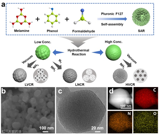 LVCR、LNCR、HVCR材料的合成过程如下所示并依次得到了缺乏介孔的LNVR材料,缺乏大孔的HVCR材料和同时拥有丰富的介孔和微孔与适量大孔的LVCR材料。通过SEM、TEM和HAADF-STEM图像可以发现LVCR展现出不均匀的球形结构并且N、O和C元素在LVCR中均匀分散。